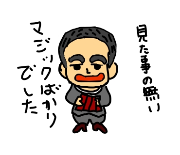 今回の印象として、サプライズはゆったりマジックを見られるスタイルで、体感はトランプマジック多め。
