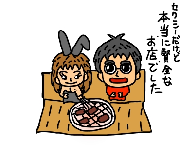 店に入ると、バニーガール姿の女の子が隣に座って焼肉を焼いてくれます。